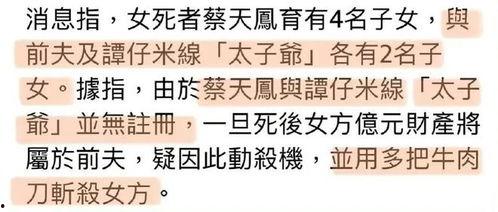 亲爱的读者们,今天我们要聊一聊一个最近闹得沸沸扬扬的案件——蔡天凤案件。这个案件牵扯到家庭、爱情、背叛和复仇,简直比电视剧还要精彩。那么,就让我们一起揭开这神秘面纱,看看背后的真相吧!